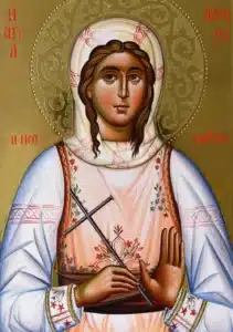 Ἐνθέως ἐνήθλησας, Παρθενομάρτυς κλεινή, αἱμάτων σου ῥεύμασι, τῆς ἀθανάτου Ζωῆς, το Δένδρον ποτίσασα. Πίστει γάρ παριδοῦσα, ἡδονάς ψυχοφθόρους, ἒῤῥηξας τοῦ βελίαρ, τάς ἐπάλξεις θεόφρον, ἡμῖν παρεχομένη σεπτῶς, χαρίσματα ἒνθεα.