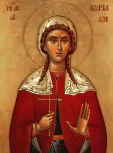 Κυρίων τὸν Κύριον, καὶ Βασιλέα Χριστόν, ἐξ ὅλης ἠγάπησας, Κυριακὴ τῆς ψυχῆς, καὶ χαίρουσα ἤθλησας, ὅθεν Παρθενομάρτυς, παρ’ αὐτοῦ δοξασθεῖσα, βρύεις τοὶς σὲ τιμώσιν, ἰαμάτων τὴν χάριν, τοὶς πάσιν αἰτουμένη, πταισμάτων συγχώρησιν.