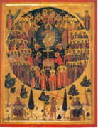 Στην εικόνα της σύναξης των Αγίων Πάντων, το άνω τμήμα το καταλαμβάνει σε κυκλική διάταξη η δόξα του Χριστού στο κέντρο, και γύρω οι χοροί των δικαίων. Η Ετοιμασία του θρόνου βρίσκεται πάνω από τη δόξα και οι δύο προφήτες Δαβίδ και Σολομών παρουσιάζονται γονατιστοί με ανοιχτά ειλητάρια. Κάτω εικονίζεται ο παράδεισος και οι προπάτορες Αβραάμ, Ισαάκ και Ιακώβ καθισμένοι σε θρόνους. Μεταξύ τους παρεμβάλλεται ο ληστής, ντυμένος μόνο με περίζωμα και κρατώντας το σταυρό. Δηλαδή, γυμνός από αρετές, αλλά πρώτος στο παράδεισο.πηγή